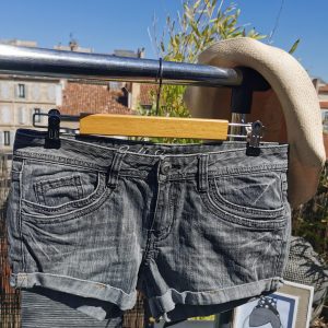 Ce short en jean fait partie d’une collection junior mais je l’ai intégré à ma boutique car il peut être porté sur une personne très fine de taille 32-XXS ou 34-XS comme le modèle